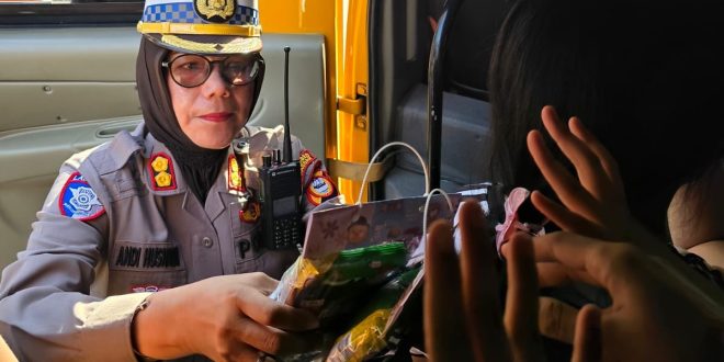Selain membagikan snack dan bunga, personel Satlantas juga menyampaikan pesan-pesan keselamatan berlalu lintas demi terwujudnya keamanan, keselamatan, ketertiban, dan kelancaran lalu lintas (Kamseltibcarlantas).